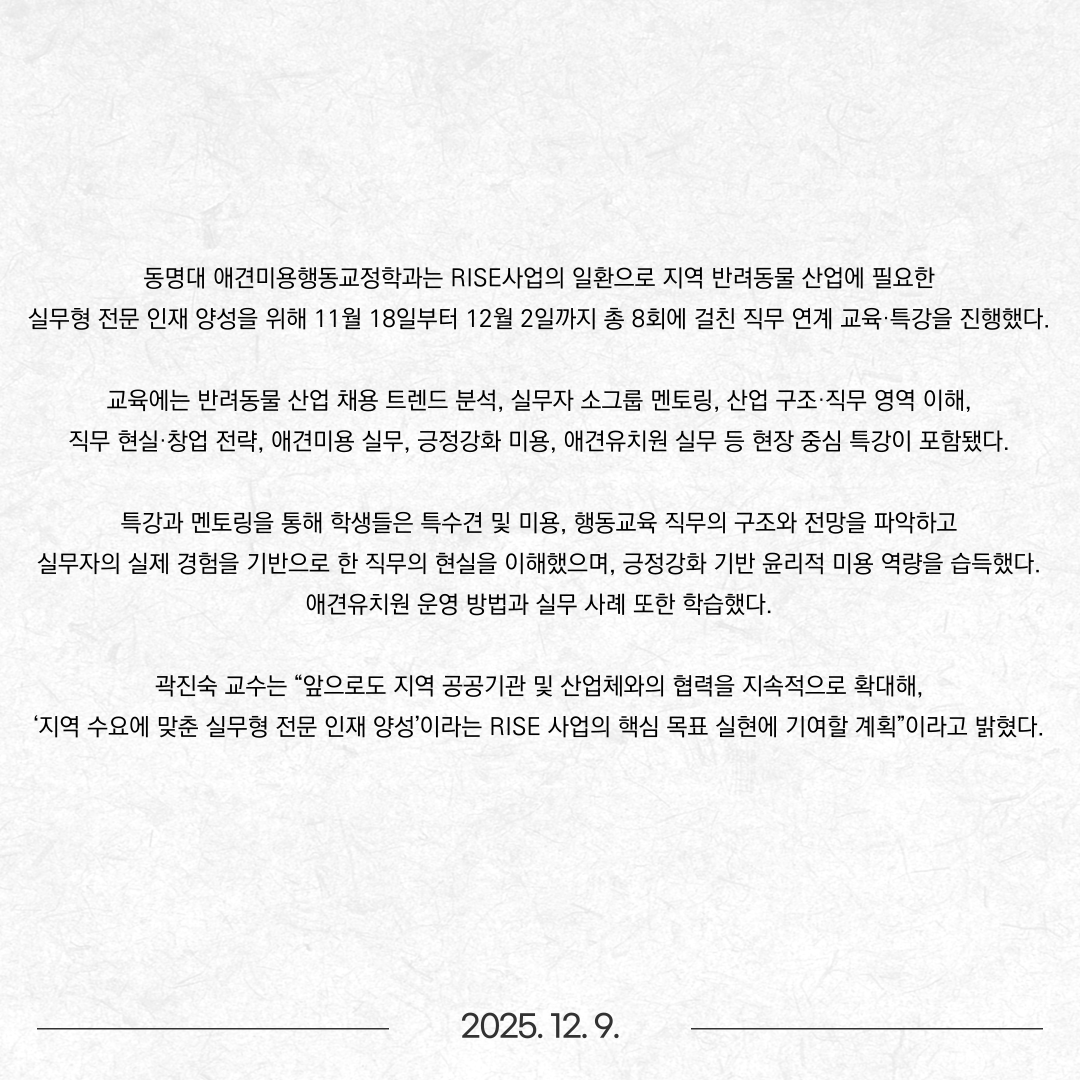 애견미용·행동교정학과, 지역 반려동물 산업 이끌 실무형 인재 집중 양성 프로그램 8회 운영